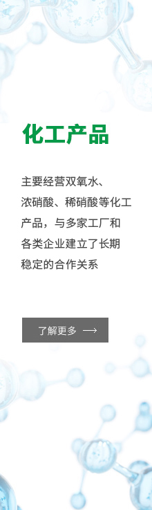 安徽安德諾化工產品銷售有限公司:位于合肥市蜀山區,交通便利,主要經營雙氧水(27.5%、35%、50%)、濃硝酸(98%)、稀硝酸(40%~68%)等化工產品,與多家工廠和各類企業建立了長期穩定的合作關系。公司產品齊全,實力雄厚,重信用、守...